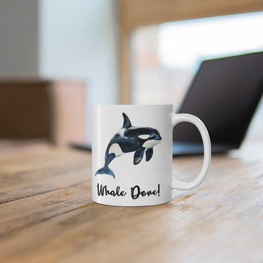 Whale Done! 11oz Ceramic Mug with Watercolor Orca Illustration