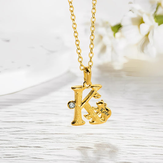 Custom Initial Bear Necklace with Birthstone + Name Engraving