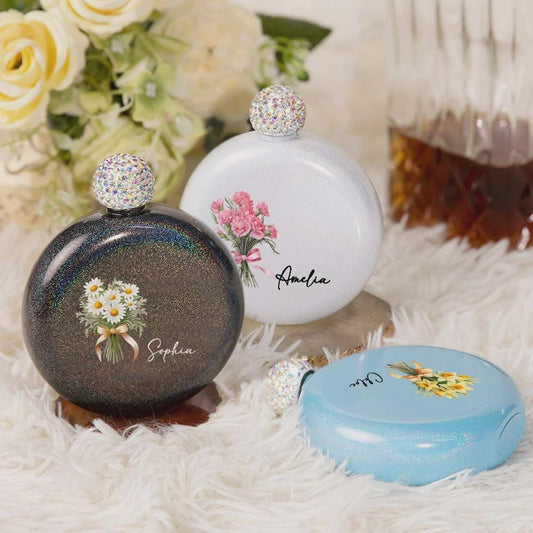 Custom Name Birth Flower Hip Flask with Diamante Lid