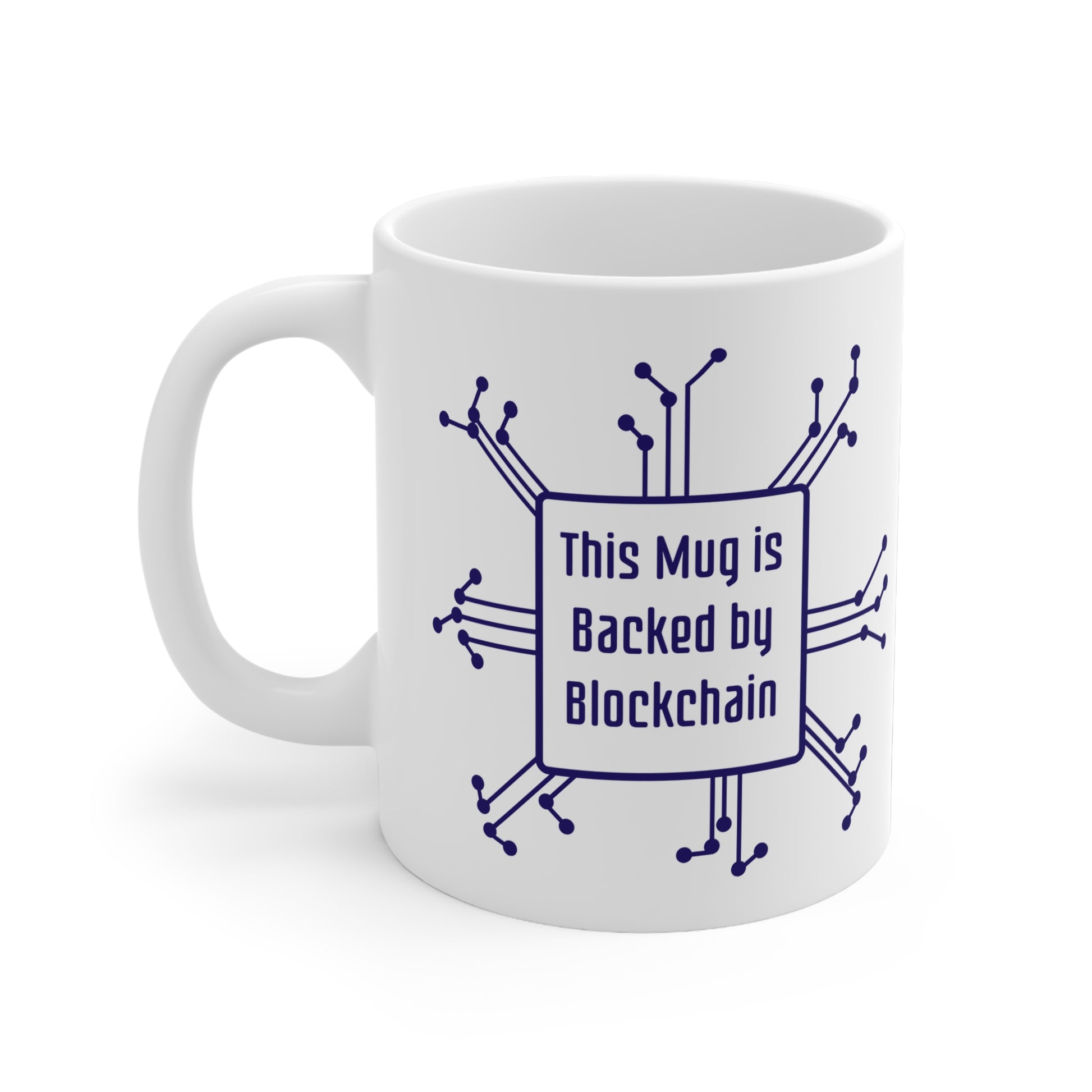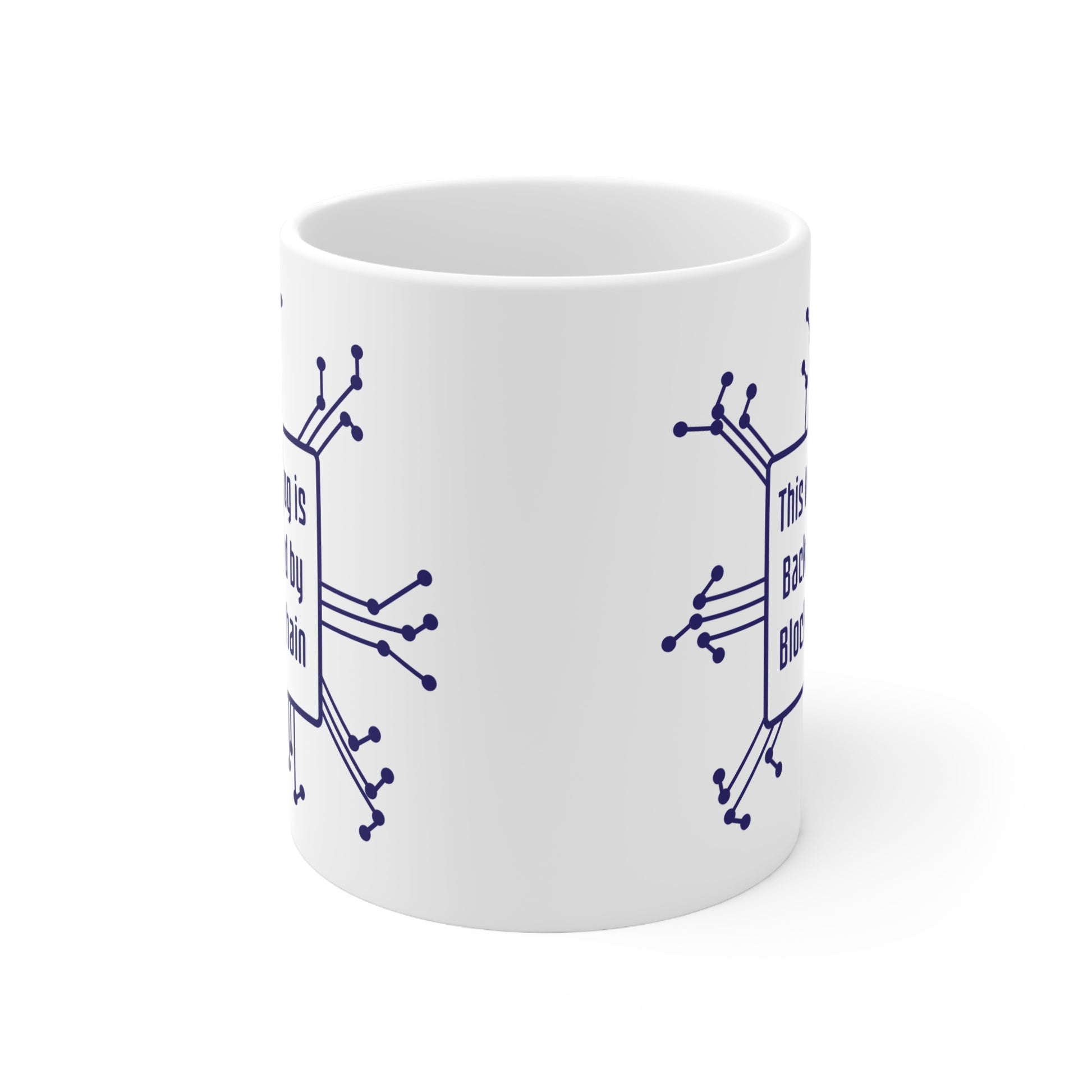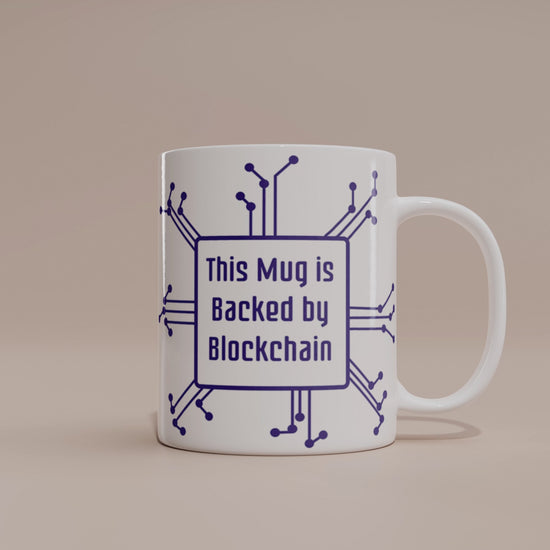 Tired of fiat? Fuel your trading sessions and crypto discussions with this premium 11oz ceramic mug, proudly declaring: "This Mug Is Backed By Blockchain!"