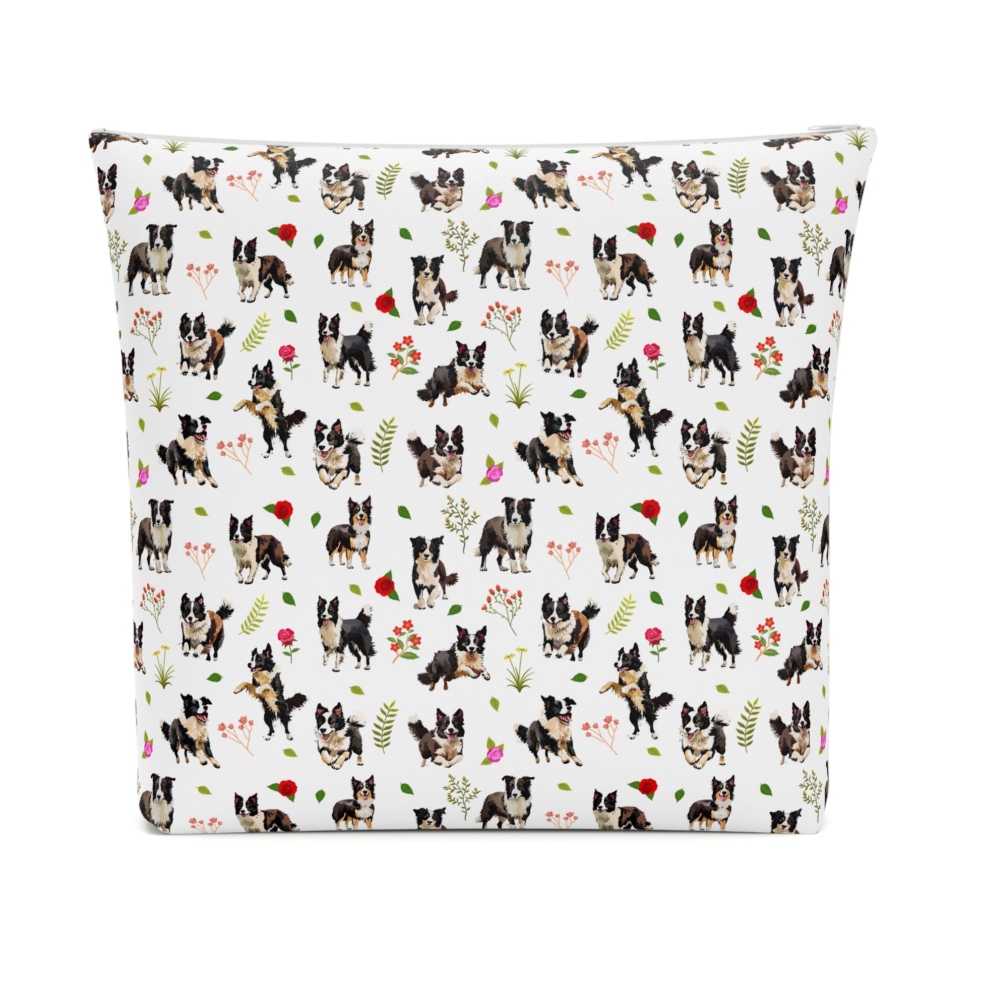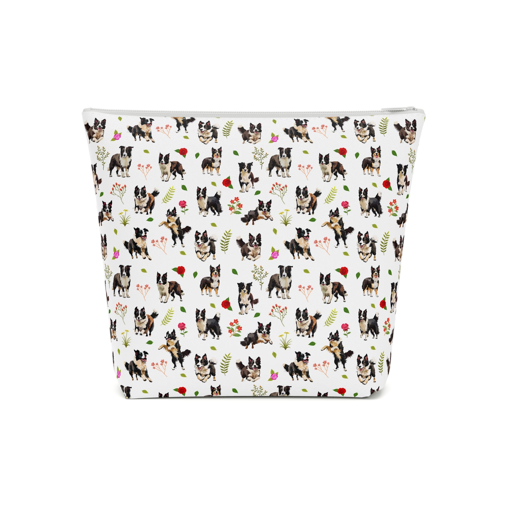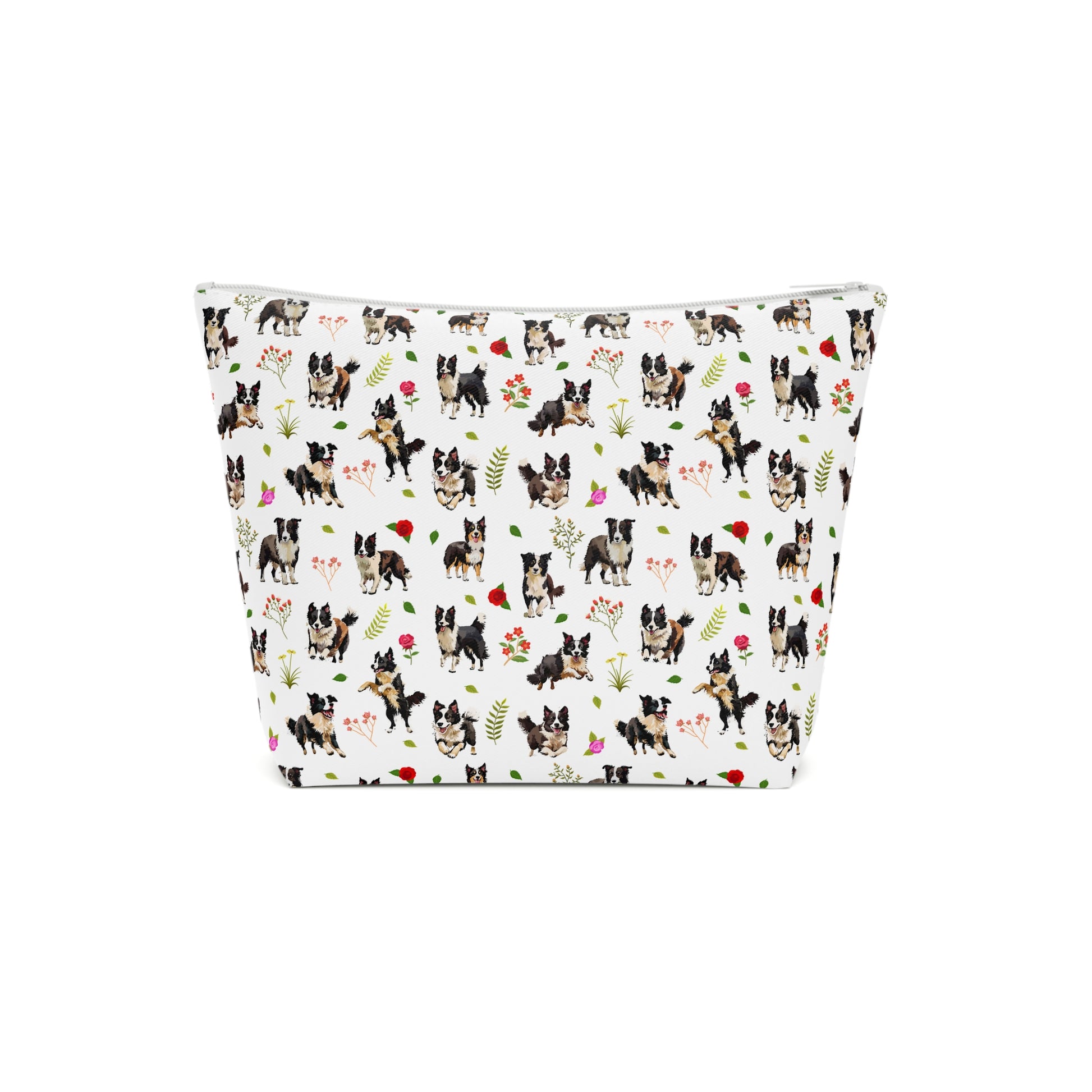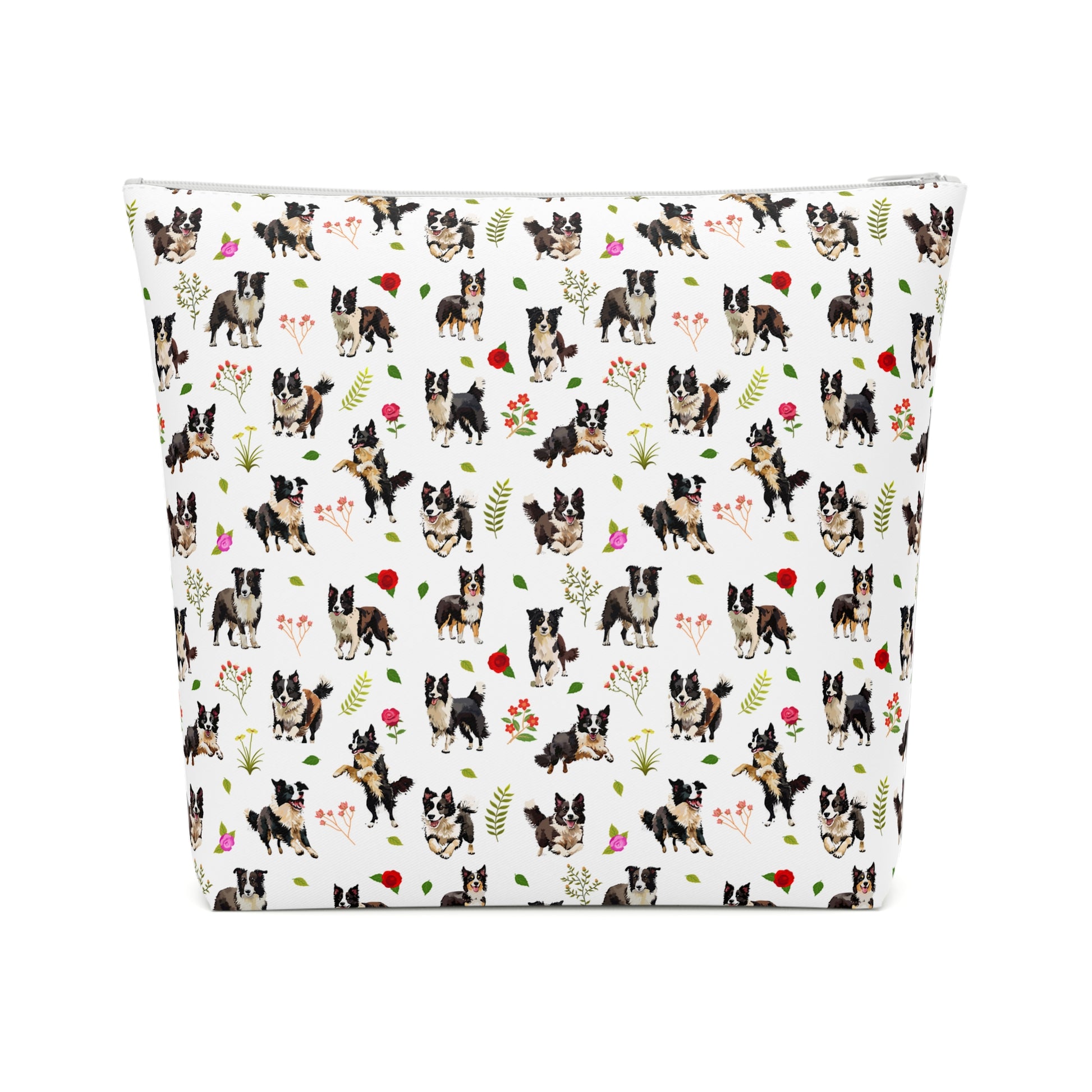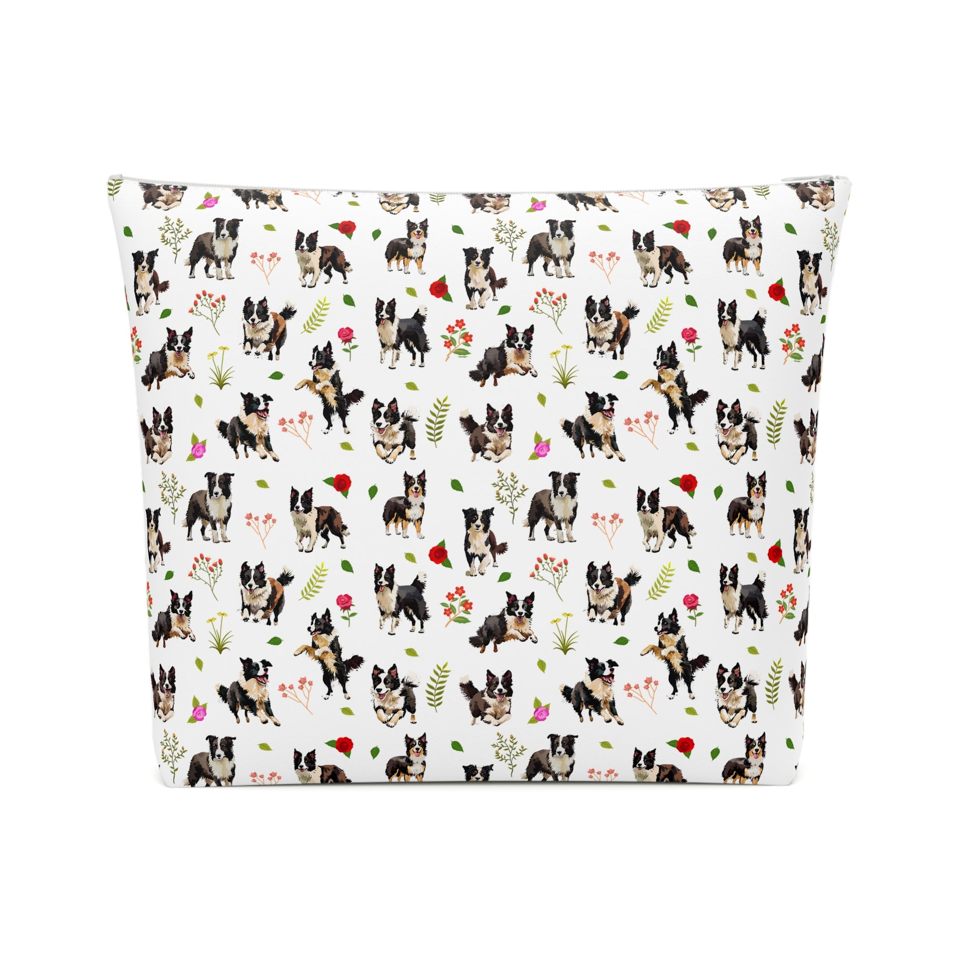Featuring a delightful print of adorable Border Collies, this bag is ideal for carrying your makeup essentials, toiletries, or even small personal items.