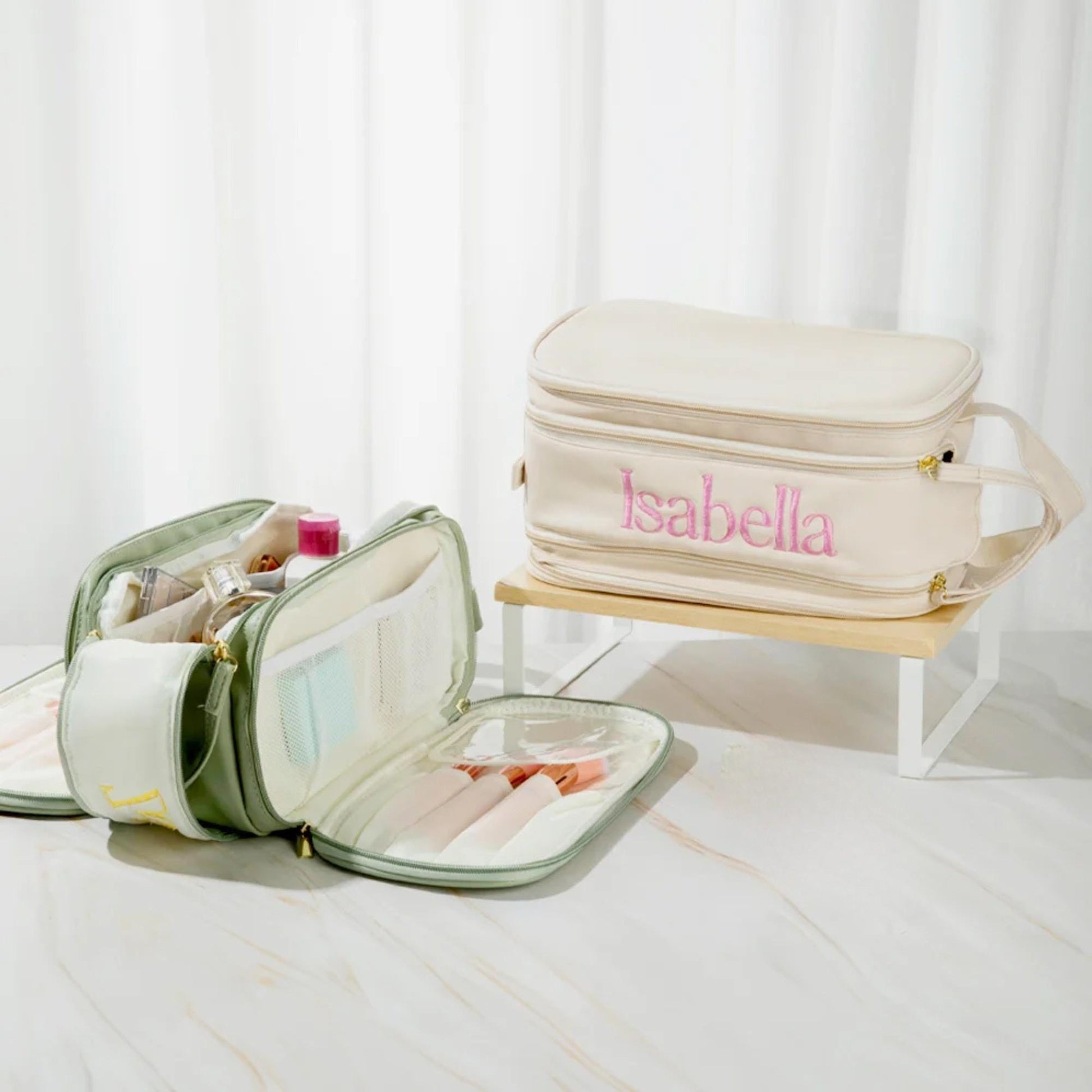 Personalize your bag with custom embroidery to make it uniquely yours or a thoughtful gift for a loved one. Ideal for moms, bridesmaids, or anyone who appreciates elegant organization, this spacious bag features multiple compartments to hold all your beauty essentials securely. Its durable leather construction ensures longevity, while the roomy interior provides ample space for larger items like brushes, palettes, and travel-sized bottles.