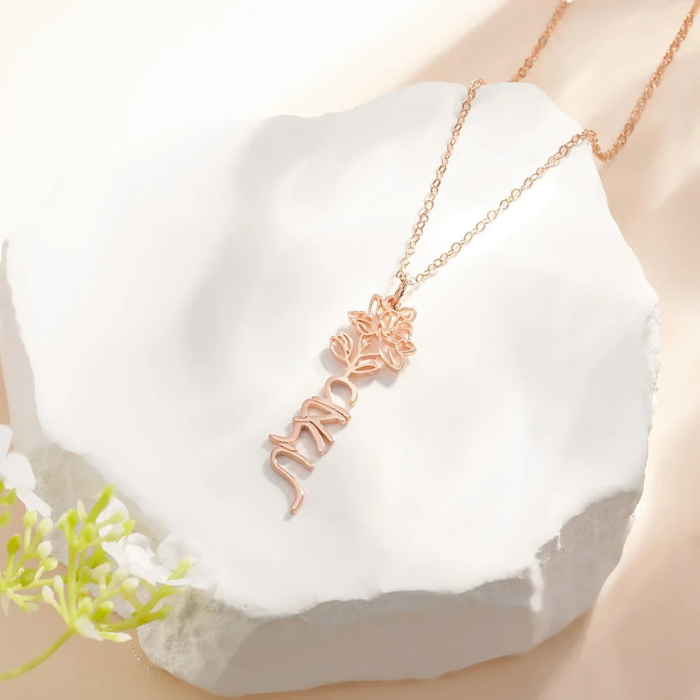 Wearing this necklace offers more than just beauty—it fosters a sense of identity, pride, and love. Imagine the joy and warmth it will bring each time she wears a piece that honors both her heritage and individuality. The subtle, natural lines of the birth flower add a graceful touch that complements the clean, authentic script of the Hebrew name, making it a daily reminder of family and personal history.