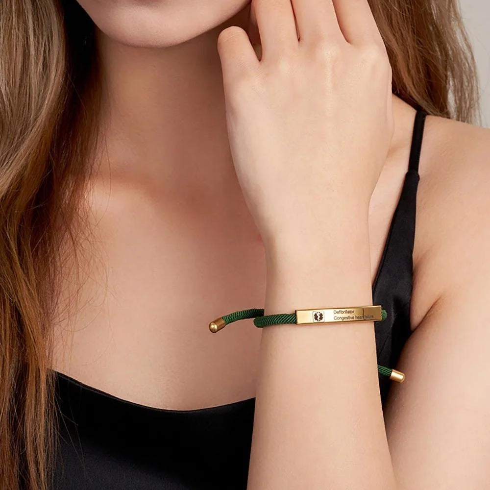 Stay prepared and safe with our Custom Medical Alert ID Bracelet featuring a soft, adjustable rope band designed for everyday comfort and durability. This personalized health info wristband ensures your critical medical details are always accessible in an emergency, setting it apart from standard alert jewelry with its modern, lightweight design tailored for both men and women. Our bracelet offers peace of mind without sacrificing style or comfort.