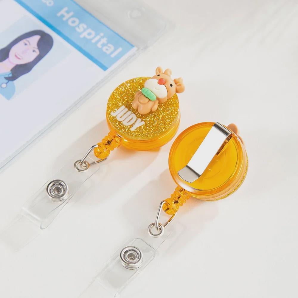 Each badge reel is custom made with your name and finished with a glittery shine that sparkles throughout the holiday season. The retractable reel makes it easy to swipe or show your ID, while the durable clip attaches securely to your scrubs, lanyard, or uniform.