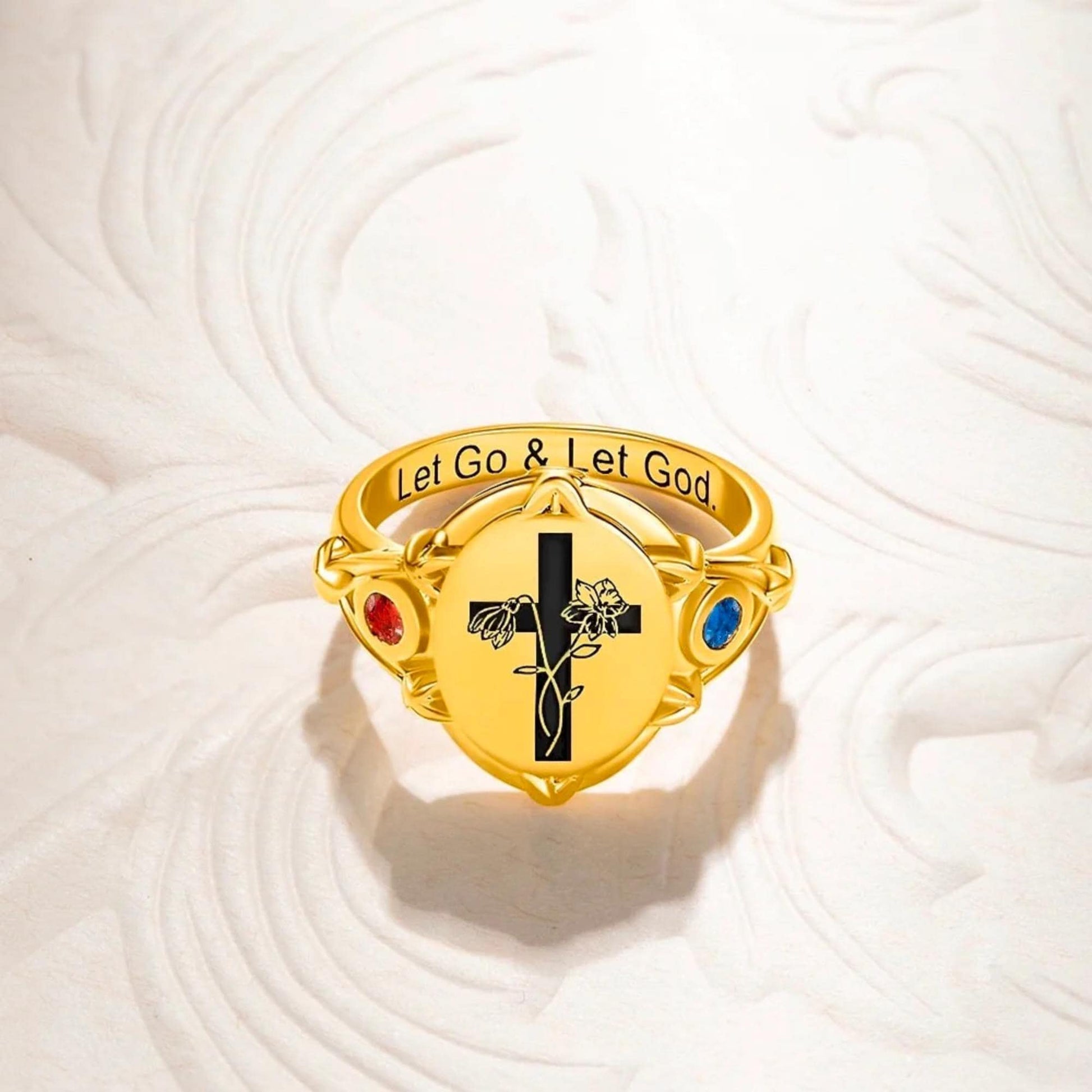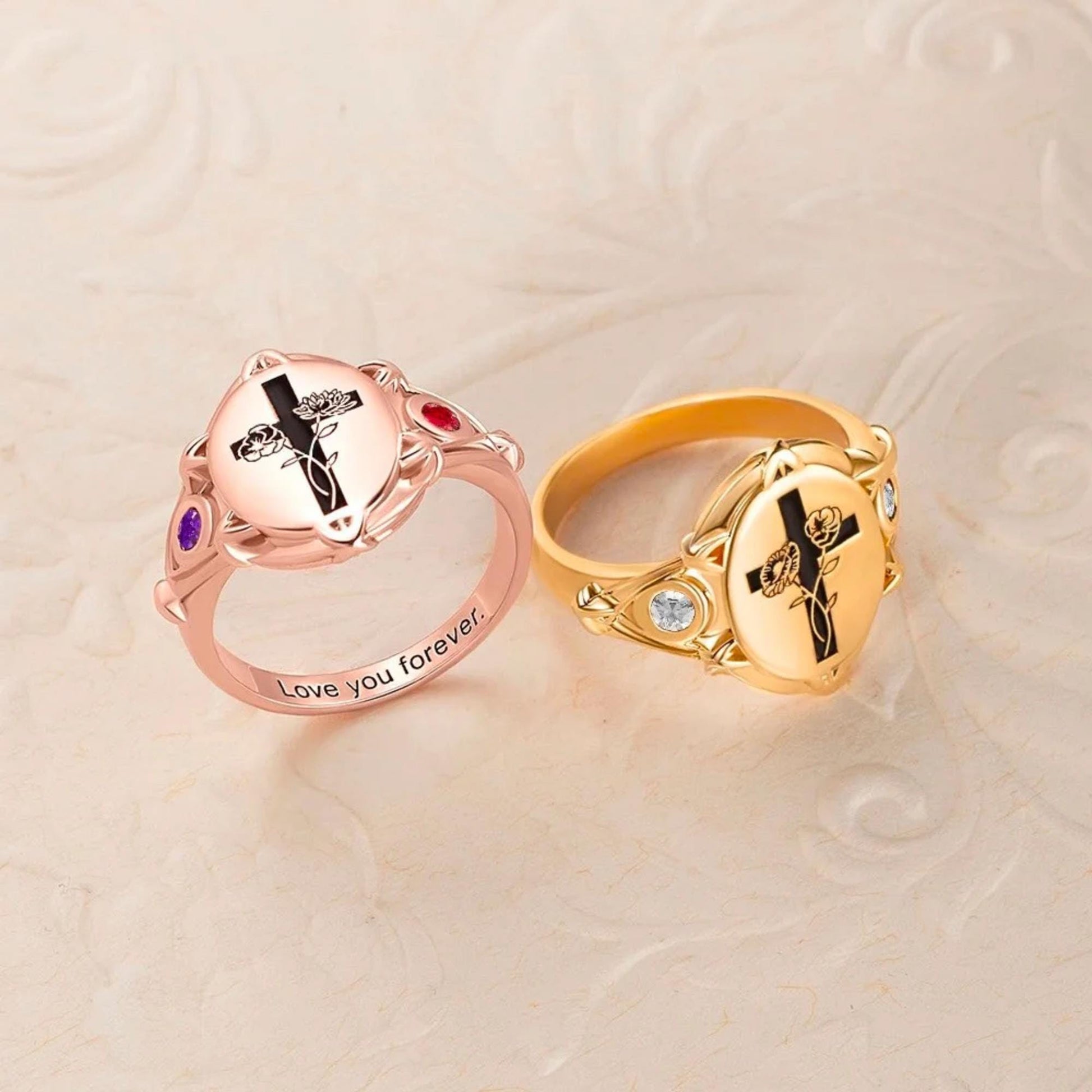What makes this ring extra special are the delicate birth flowers and birthstones embedded into its design, representing the month of your birth and adding a touch of natural beauty. Whether you’re honoring a loved one or celebrating your own birth month, this detail makes each piece uniquely meaningful. The elegant cross motif enhances its spiritual significance, making it a versatile accessory that complements both daily wear and special moments.