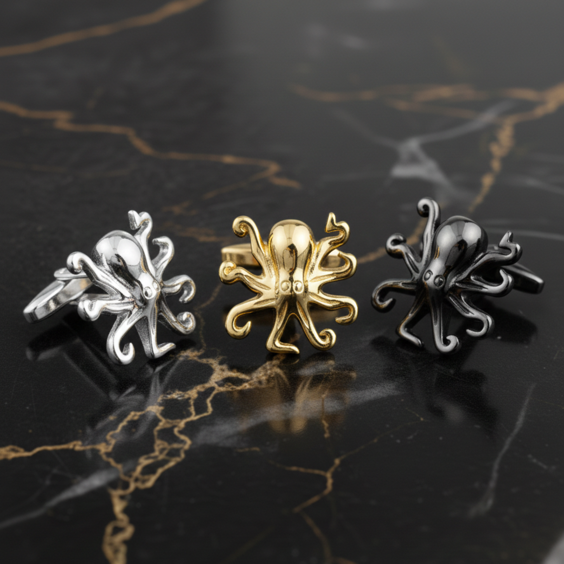 These stunning accessories are a masterclass in detail, capturing the fluid and enigmatic form of the ocean's most intelligent inhabitant. Each piece features a beautifully sculpted octopus shape, with intricate tentacles that wrap elegantly to create a bold, three-dimensional look on your shirt cuffs.
