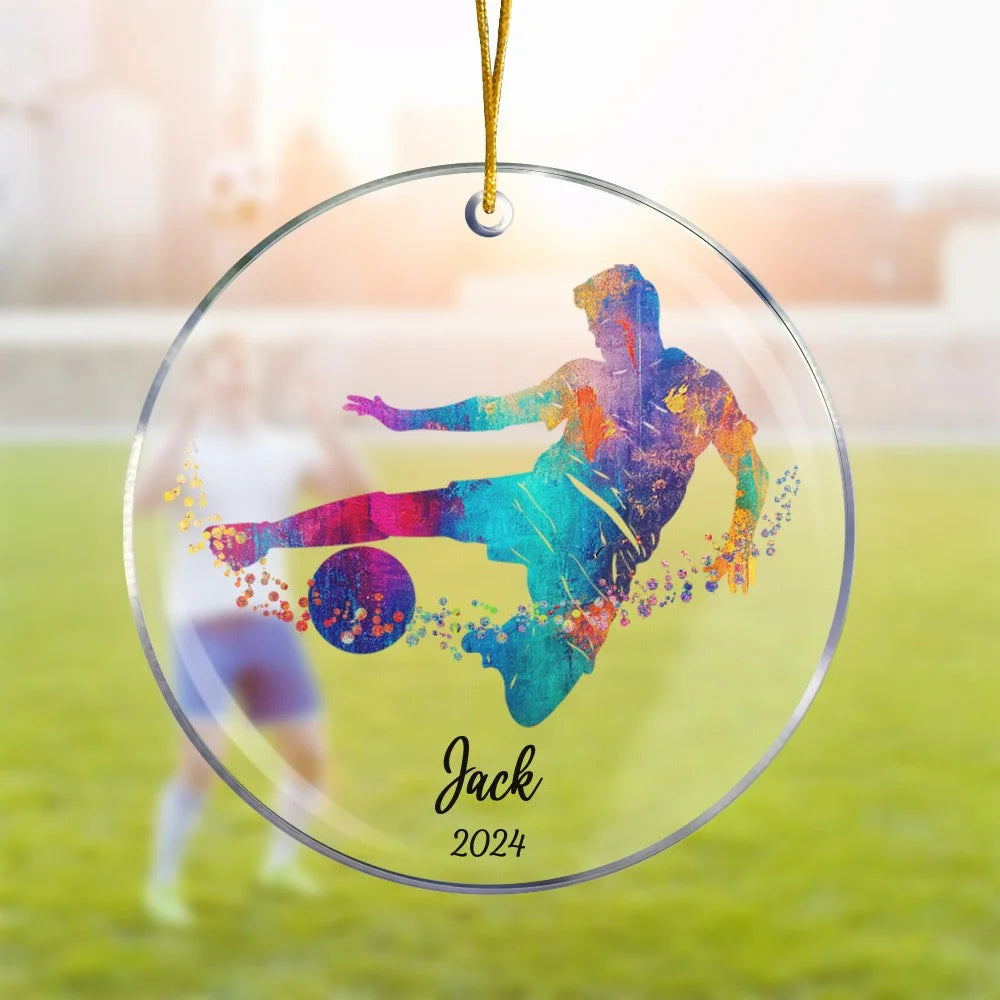 Each ornament is a unique piece of art, showcasing a vibrant watercolor design that brings the soccer silhouette to life with rich colors and expressive strokes. To make it an even more special keepsake, this ornament can be personalized with a name and year. Imagine your favorite soccer player’s name, a team name, or a significant year beautifully displayed alongside the iconic soccer silhouette, commemorating a memorable season or a lifelong passion.